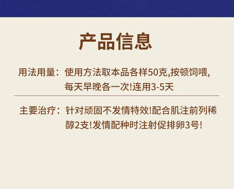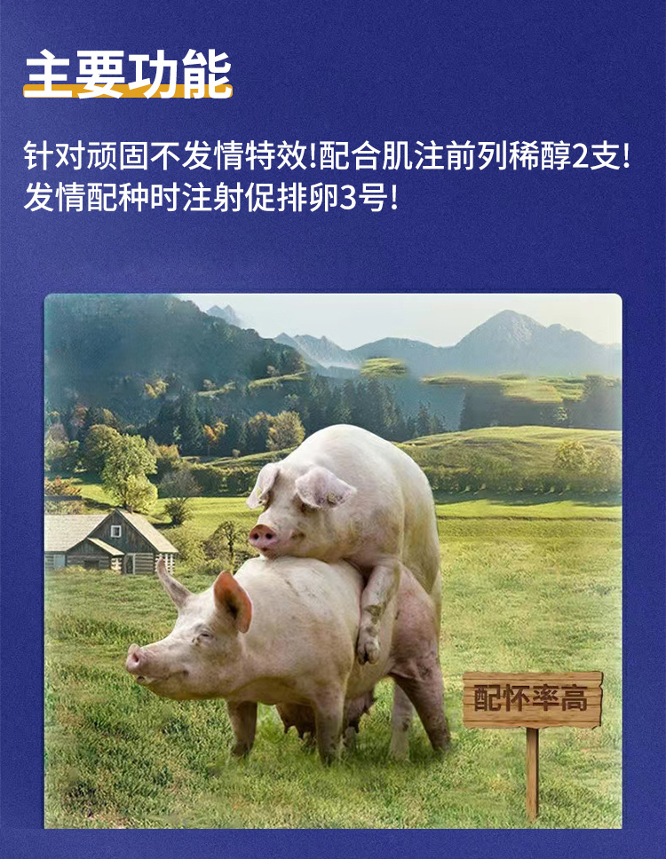 產品簡介:針對頑固不發情有特效,配合肌肉注射前列稀醇2支,發情后配種前注射促排卵素2支即可;