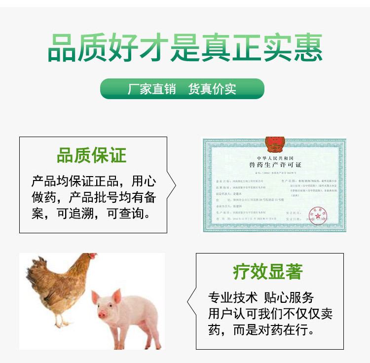 4、輔助藥物使用時本品500g溶解于500kg飲水中,或拌料250kg,連用5-7天。