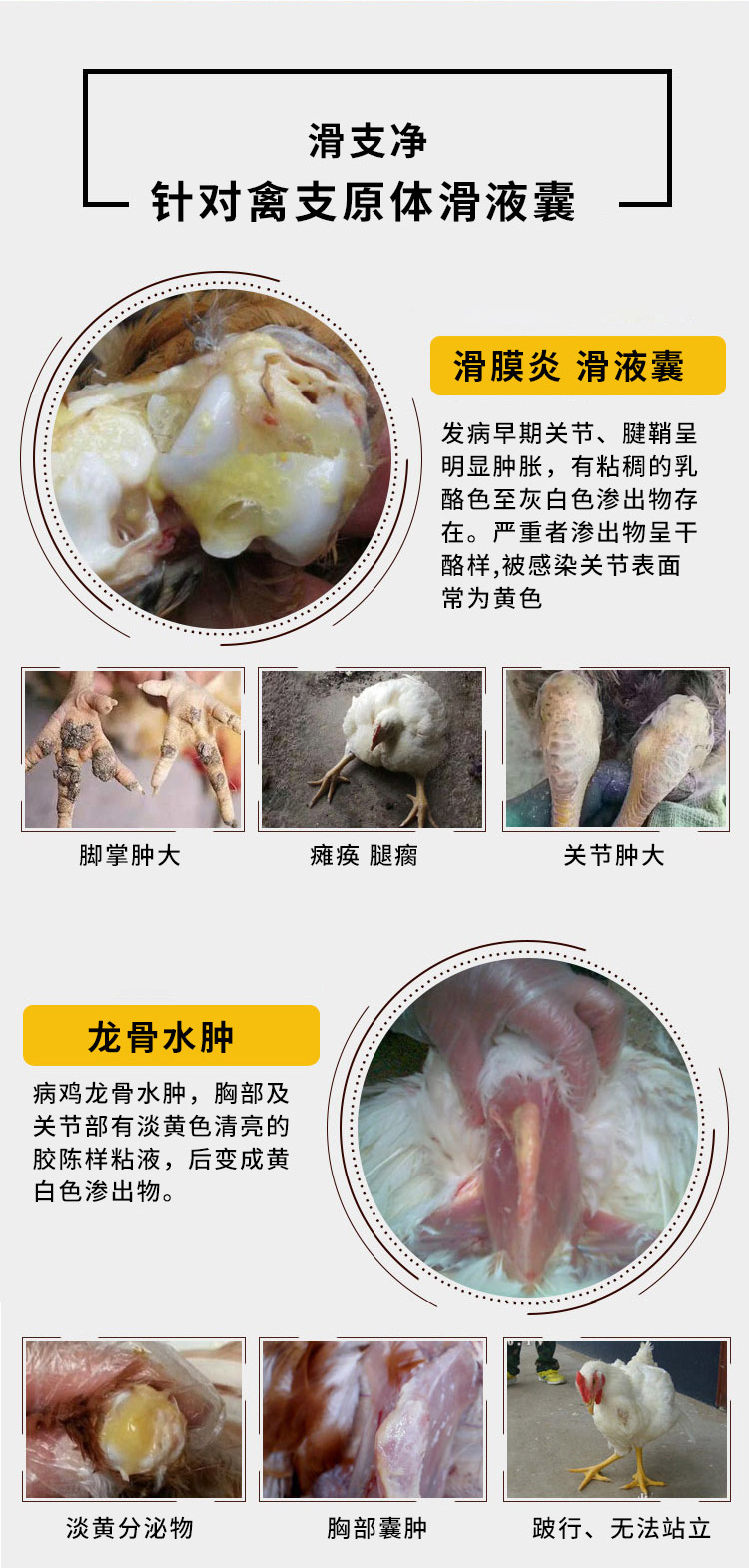 1、用于禽滑液囊支原體:可見:消瘦、脫水、生長停滯,食欲下降,腱鞘炎、滑膜炎、關節炎,胸骨皮下囊腫等。