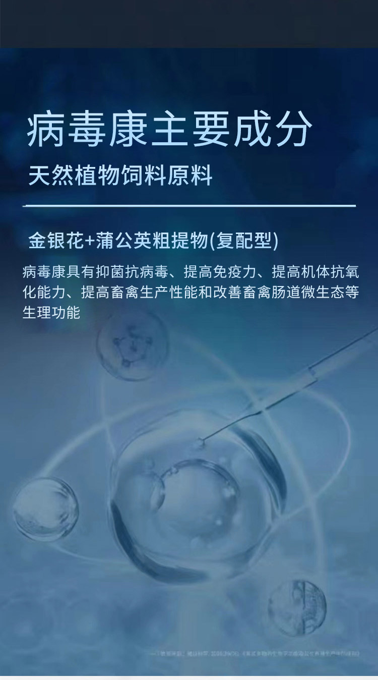 病毒康具有抑菌抗病毒、提高免疫力、提高機體抗氧化能力、提高畜禽生產(chǎn)性能和改善畜禽腸道微生態(tài)等生理功能。