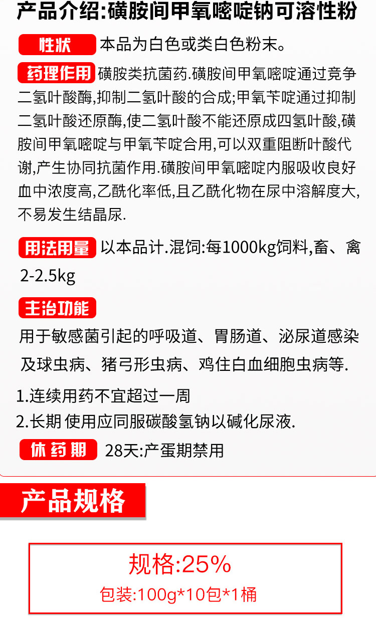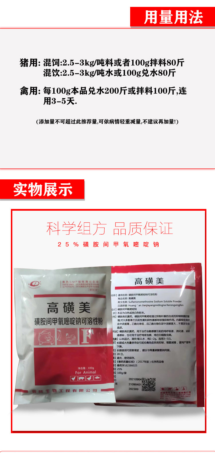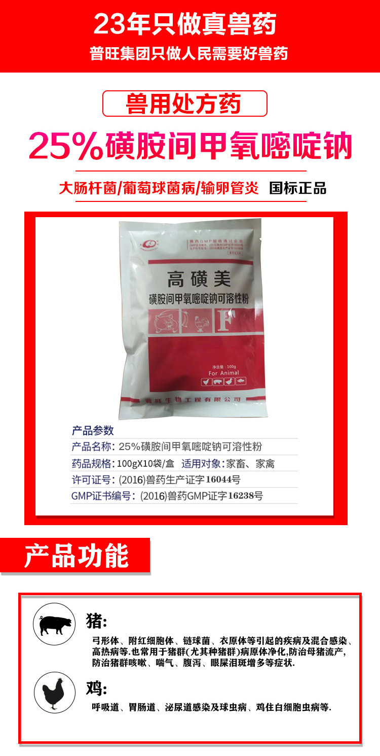 產(chǎn)品簡介:豬:弓形體、附紅細(xì)胞體、鏈球菌、衣原體等引起的疾病及混合感染高熱病等.也常用于豬群(尤其種豬群)病原體凈化,防治母豬流產(chǎn),防治豬群咳嗽、喘氣、腹瀉、眼屎淚斑增多等癥狀. 雞:呼吸道、胃腸道、泌尿道感染及球蟲病、雞住白細(xì)胞蟲病等.