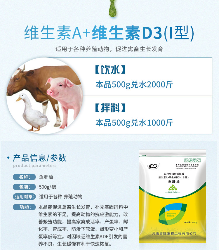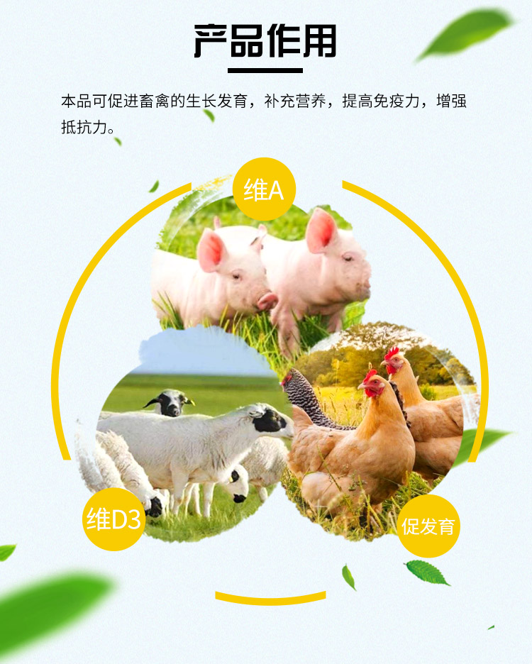 【功能與特點】本品能促進畜禽生長發育,補充基礎飼料中維生素的不足,提高動物的抗應激能力,改善繁殖功能,提高家禽成活率、產蛋率、孵化率、育成率、防止下軟蛋、蛋形變小和產蛋率降低等癥。對因缺乏維生素ADE引起的發育不艮,生長緩慢,有利于快速恢復。
